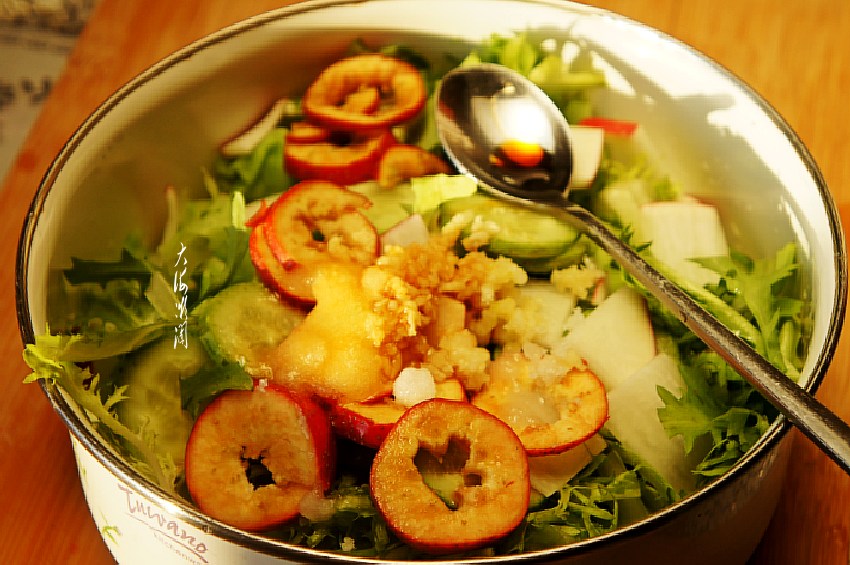 【爽口凉拌菜】所需食材:苦菊1棵;甘蓝菜3片;黄瓜1根;红萝卜1快;山楂3个;醋适量;糖适量;味极鲜酱油适量;花生碎适量;油茶籽油适量;油腐乳适量。