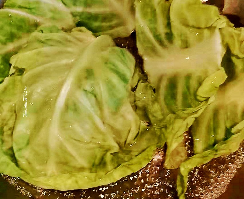 3、锅中加入适量的水,水开下入甘蓝菜焯水,颜色变绿后捞出过冷水,控净水分。