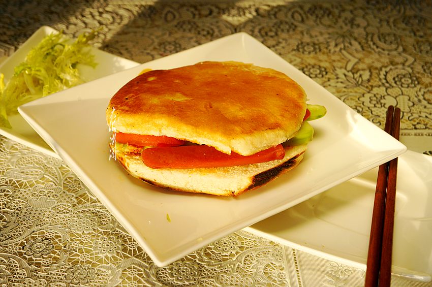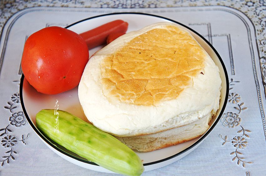 【中式三明治】所需食材:发面饼2个;风味香肠2根;黄瓜1根;西红柿1个;鸡枞油腐乳适量;油适量。
