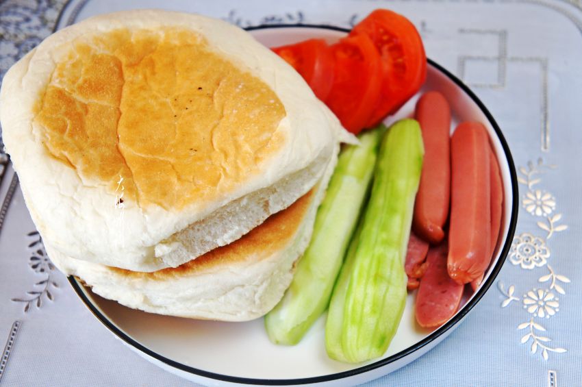 4、然后每个饼塞入西红柿2片,黄瓜2片,风味香肠3到4片。
