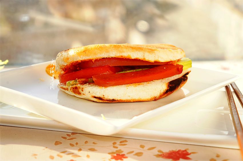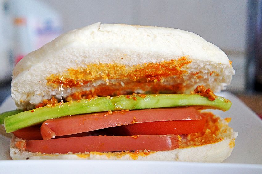 2、中式三明治,里边加什么不重要,重要的是要好吃还有营养,可以多放一些蔬菜水果类,也可以煎个鸡蛋放在里边,总之随自己喜欢的口味添加。