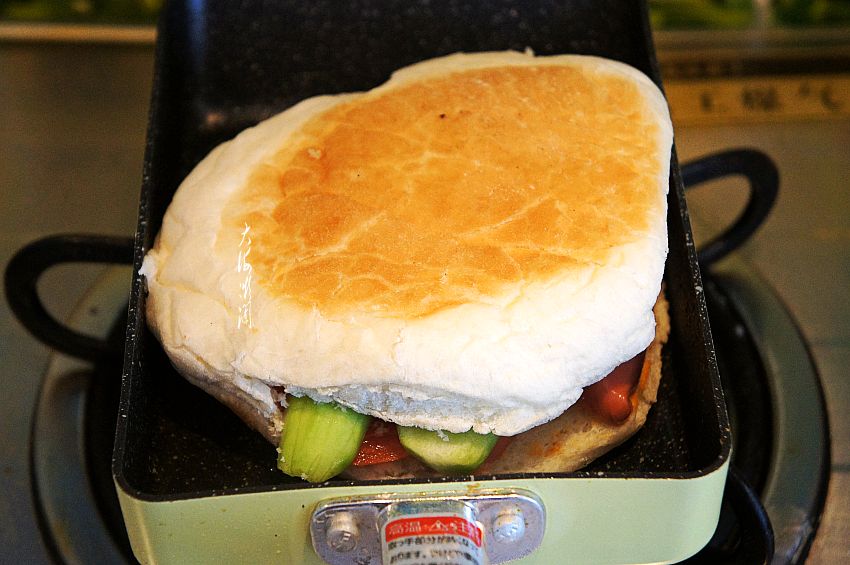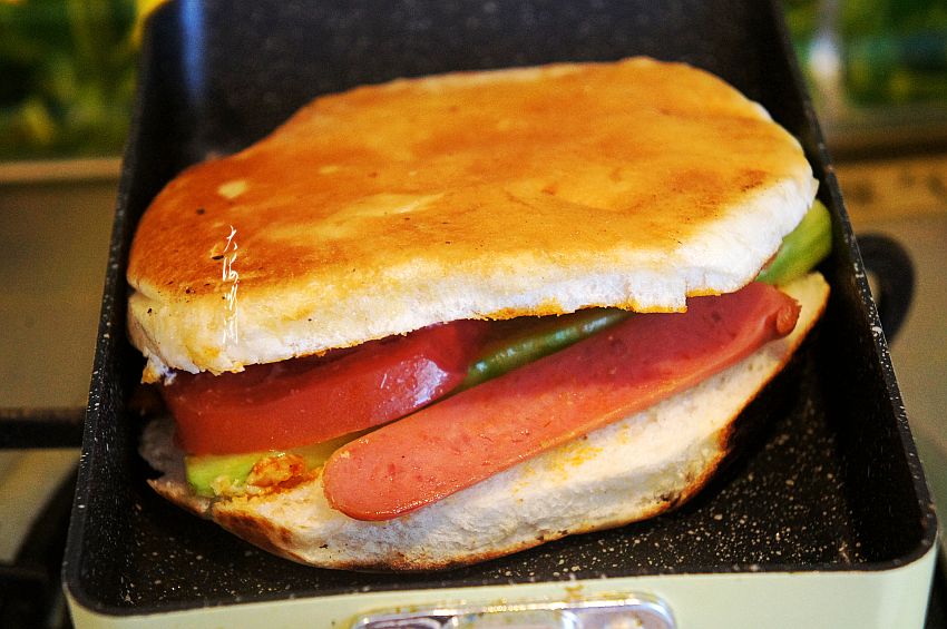 5、玉子烧煎锅或者平底不粘锅薄薄的刷层油,放入包好的发面饼,小火煎,作为中式三明治是可以直接吃不用煎的,但是北方这个季节有点冷了,煎一煎热乎乎的特别有食欲,吃到胃里也舒服,尤其适合老人和孩子。