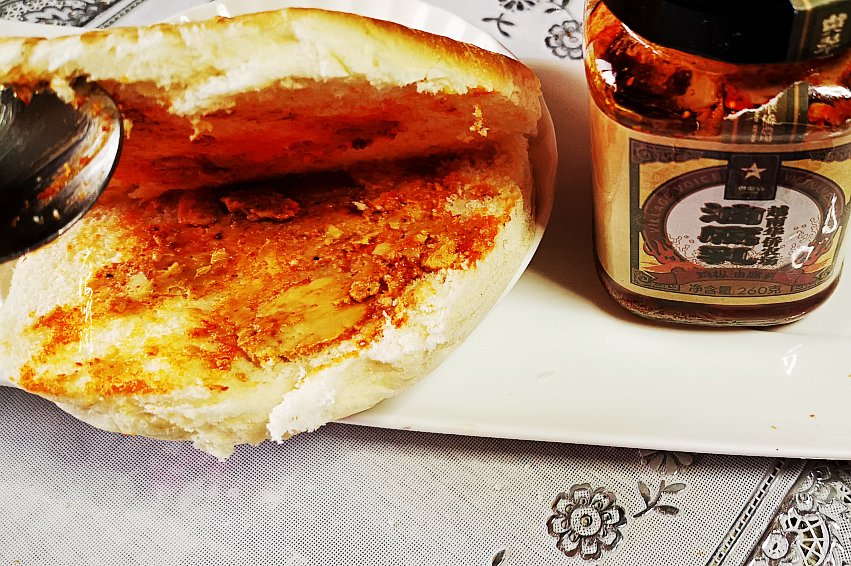 3、发面饼中间切开,不切透,先抹上一层鸡枞油腐乳,上下都抹。