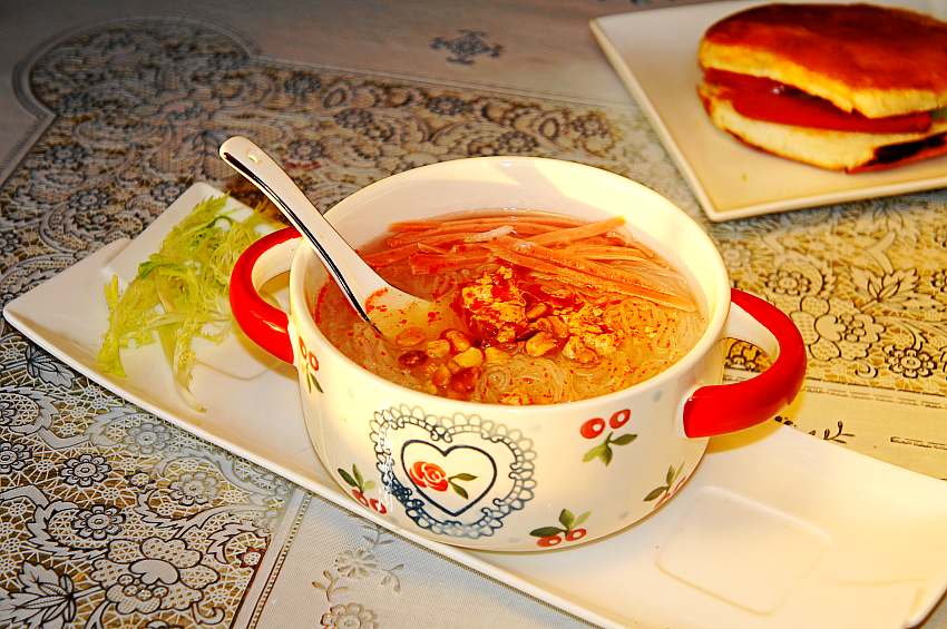 秋冬季节,北方人对萝卜也是情有独钟,不论是红烧、清炒、肉炖、包馅、凉拌还是煲汤,都是餐桌上倍受青睐的美味,前几天好朋友晒了好多的萝卜干送给我,早晚拌点小咸菜,那也是非常独特的下饭菜。不过我家独宠萝卜条粉丝汤,经常临时被搭配上桌,比番茄蛋花汤还简单,重要的是你可以吃到各种滋味,出锅后想吃什么口味,就调成什么味道,极其方便,大海今天加了鸡枞油腐乳,一款百搭食材,拌饭入菜都好吃,特别的香味弥漫在汤汁中,特别鲜香,好吃又下饭。萝卜富含较多的膳食纤维,其中所含的芥子油和精纤维可促进胃肠蠕动,有利于机体内废物和毒素的排泄,所以多吃萝卜有益身体健康,而且好吃不长肉,越吃越苗条。