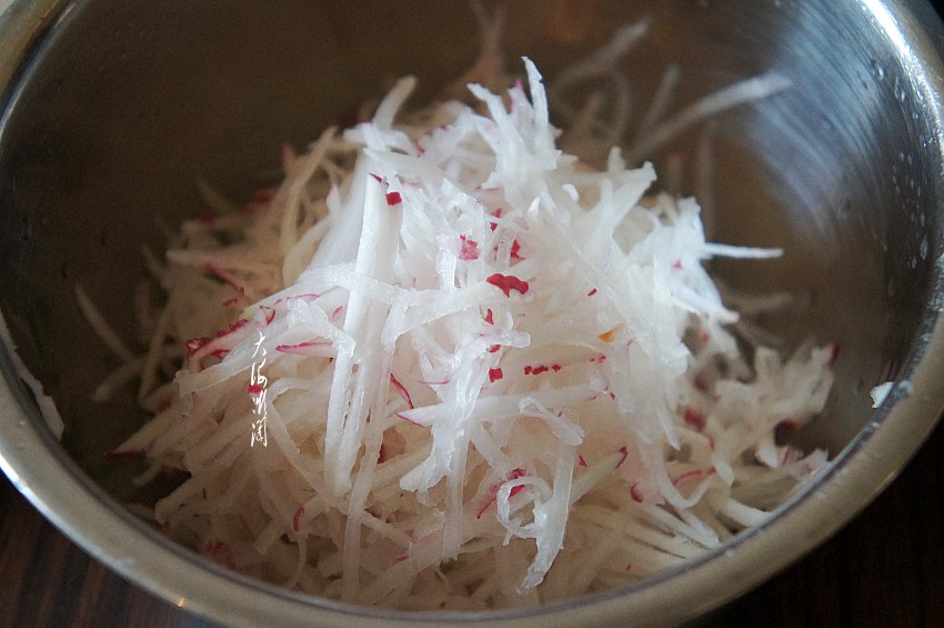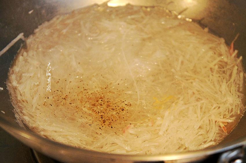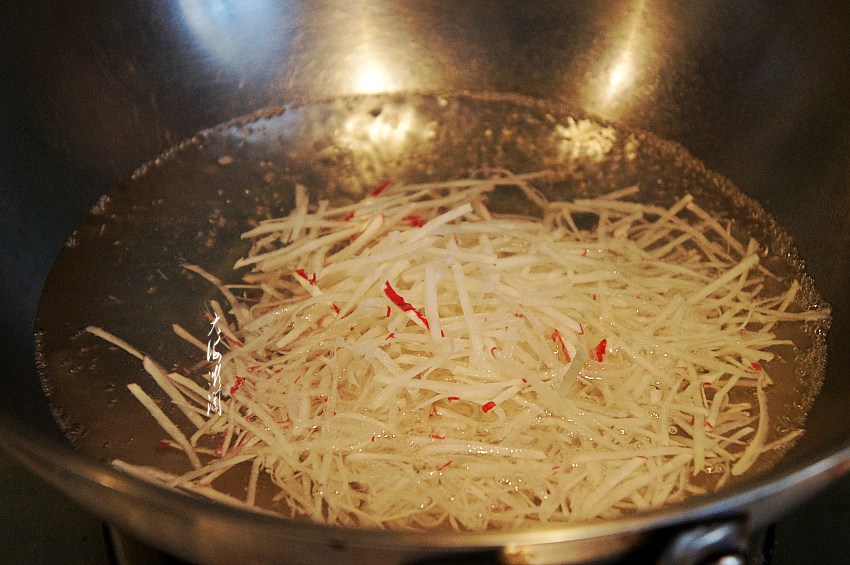 2、这种做法,要先烧开水,再下入萝卜丝,这样做口感好,否做煮烂就不好吃了。