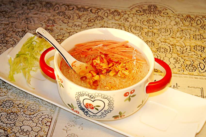 【萝卜条粉丝汤】萝卜适量;粉丝适量;胡椒粉适量;盐适量;葱适量;花生碎适量;油腐乳适量。