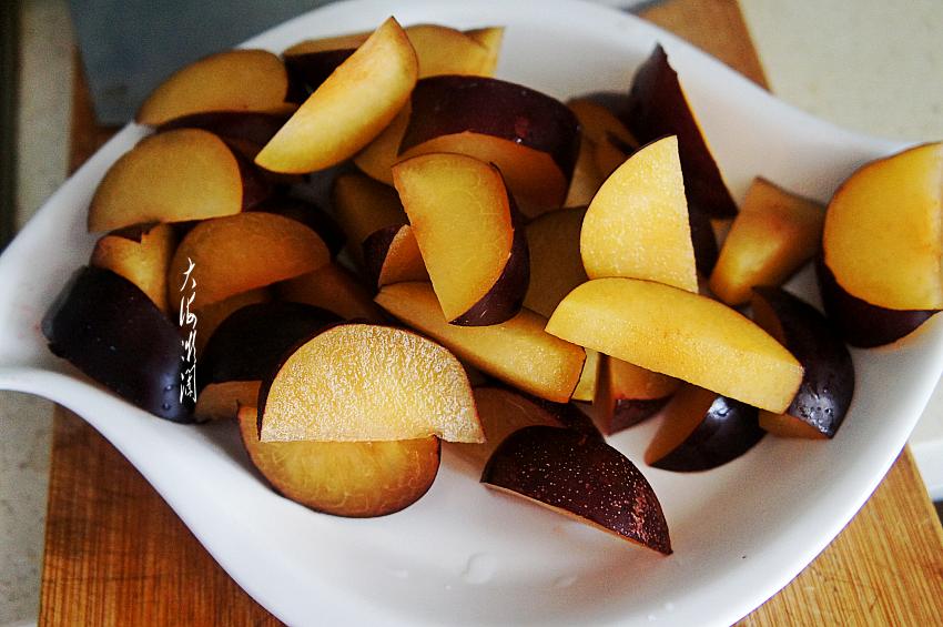 2、清洗干净的李子切成块,可以大一点的块,李子不耐煮。