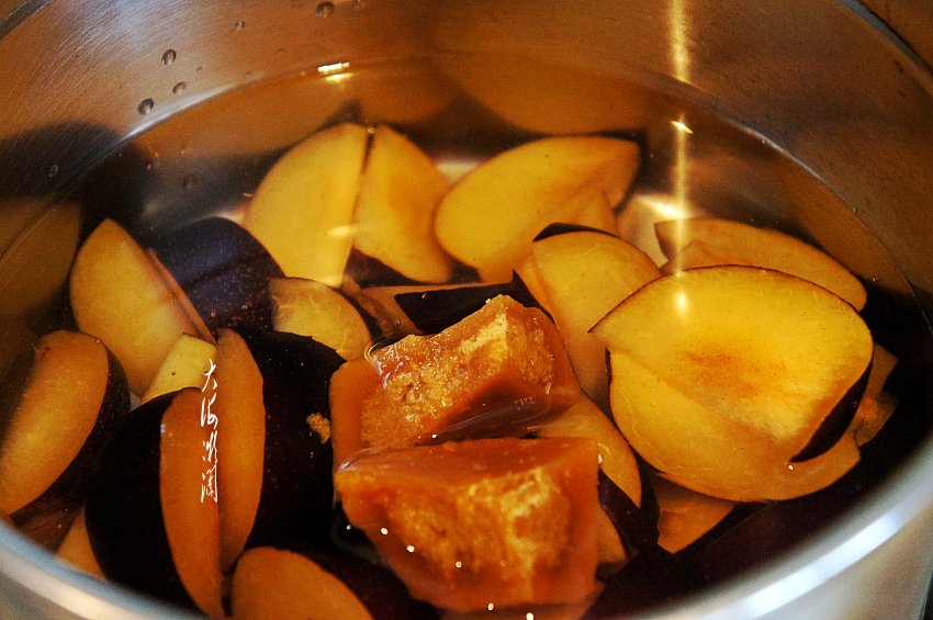 5、将红糖块切开,根据自己喜欢的甜度加入大约四分之一的量或者三分之一的量都可以,大火烧开。