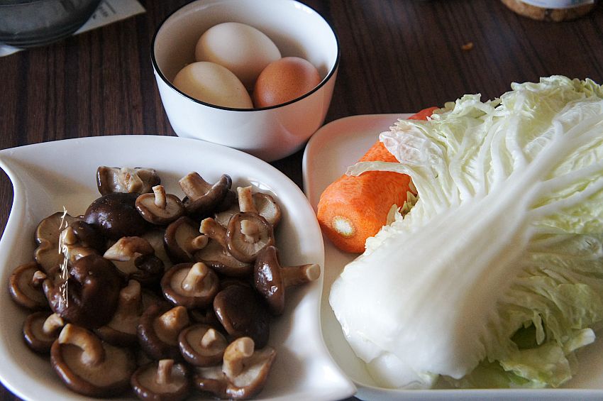 2、准备馅料。香菇摘洗干净焯水,然后过冷水再反复清洗干净,一定要注意香菇表面的碎末末,只有焯水后才能清洗干净。胡萝卜去皮洗净,白菜在淡盐水中浸泡10分钟以上,反复清洗干净。