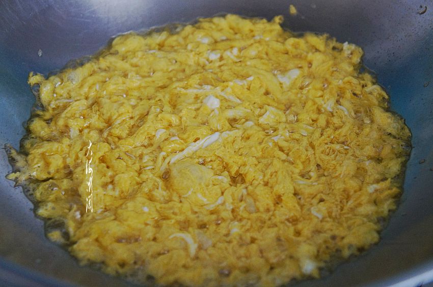 4、鸡蛋打散,炒锅加入适量的油(可多加一点,拌馅时不另加油),倒入鸡蛋液搅拌碎碎的煎熟。