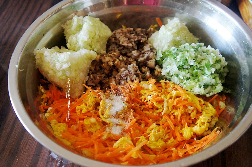 3、很多人做白菜馅一直纠结要不要焯水,大海告诉你一定不要焯水,焯水后不但营养流失,而且口感不好。正确的做法是大白菜洗净切碎,加点盐腌制10分钟,然后攥掉水分就好了,口感脆嫩。胡萝卜擦丝,香菇切碎,葱去皮洗净切碎。