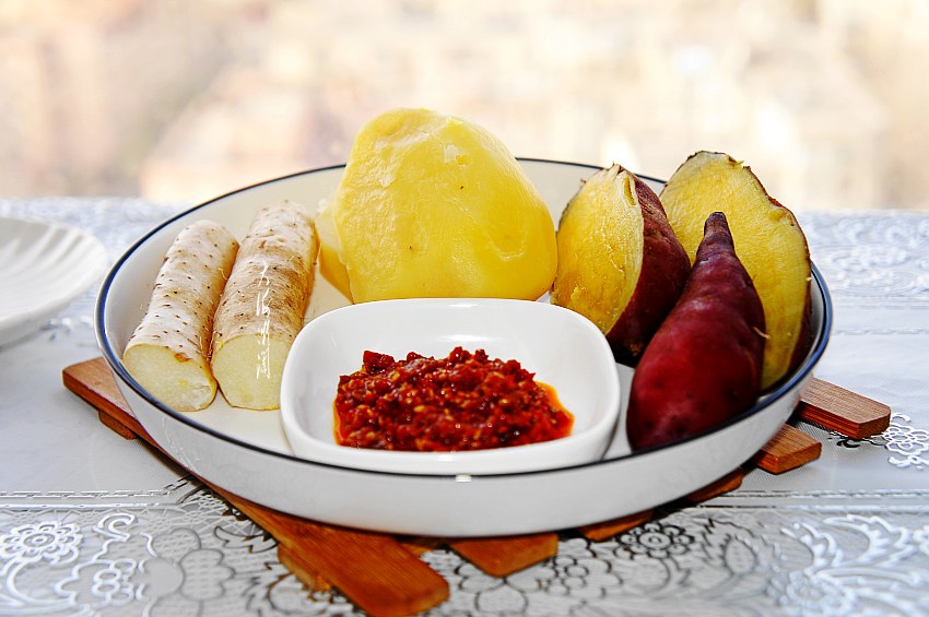 【蒸红薯山药土豆】所需食材:红薯5个,山药1根;土豆1个;自制辣椒酱适量。