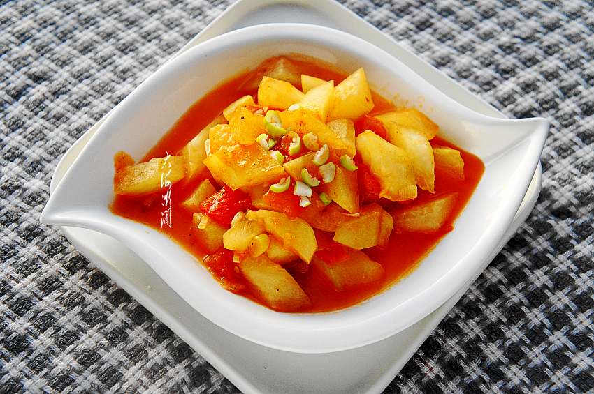 这菜就是冬瓜,冬瓜是我们餐桌上常见的菜品之一,是瓜菜中不含脂肪的蔬果,被称为“减肥瓜”。冬瓜含有丰富的蛋白质,脂肪,脲酶,皂苷B族维生素等。富含人体所需的各种氨基酸,且膳食纤维含量很高,利水排湿,有瘦身美容的作用,因而十分受女士的欢迎。而且中医上认为,冬瓜味甘、淡、性凉,入肺、大肠、小肠、膀胱经。具有润肺生津、化痰止渴、利尿消肿、解毒排脓之功效,可见冬瓜确实是“上火”的克星。冬天吃它有利于清肺火,冬瓜也是百搭食材,与各种肉类搭配,不但解腻,而且比肉都香,煲汤及各类甜品都有它的身影,与西红柿搭配,这色彩真是吸人眼球,看着就流口水,出锅加点红油,微辣的口感,开胃下饭,我一人都能吃一盘,常吃想不瘦都难。