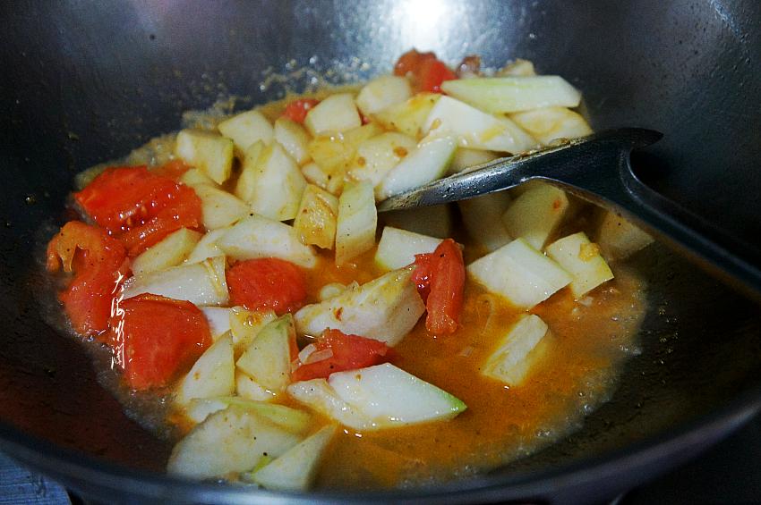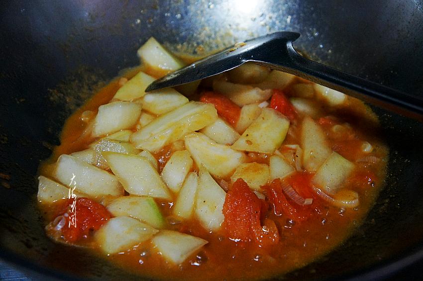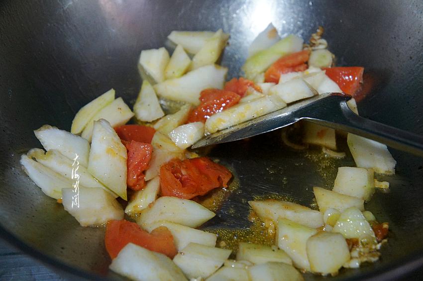 2、冬瓜切块,通常不易炒熟,少加点水,炖上两三分钟,刚好炖熟,熟而不烂,口感特别好。