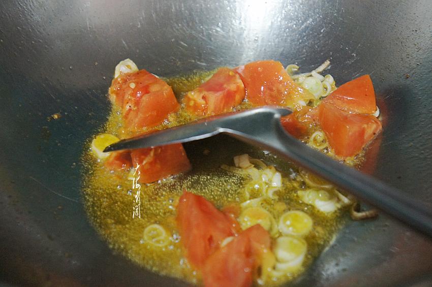 3、炒锅加入适量的油,撒少许五香粉、葱花爆出香味,加入番茄翻炒,炒至番茄出汤汁