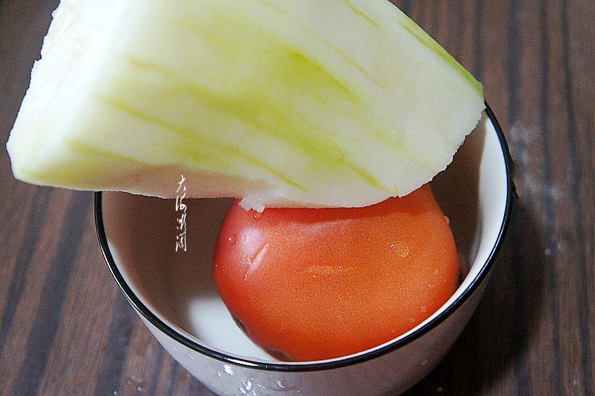 做法及步骤:1、西红柿在淡盐水中浸泡10分钟左右,清洗干净,冬瓜去皮去瓤洗净。