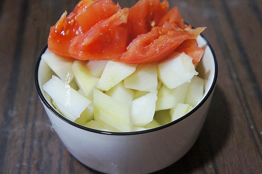 2、冬瓜切菱形块,西红柿切块。可根据个人的喜好,西红柿开水烫一下去皮口感更好。