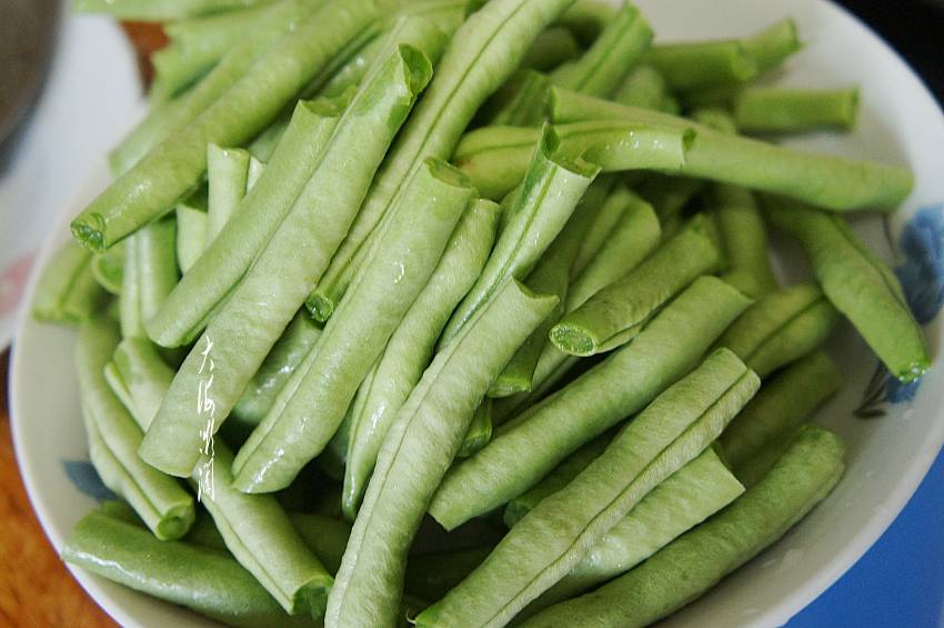 5、架豆角在淡盐水中浸泡10分钟,反复清洗干净,切段。