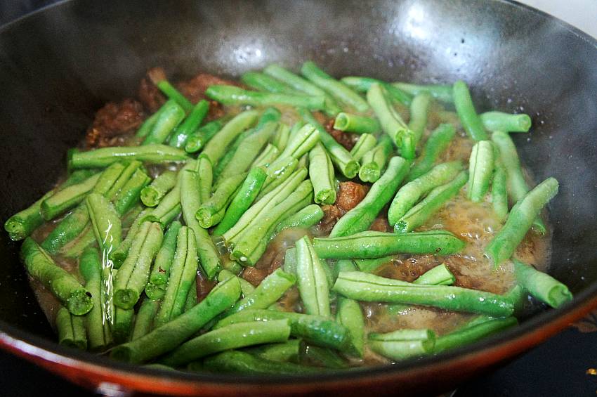6、待排骨基本炖熟,加入架豆角继续炖5分钟左右。