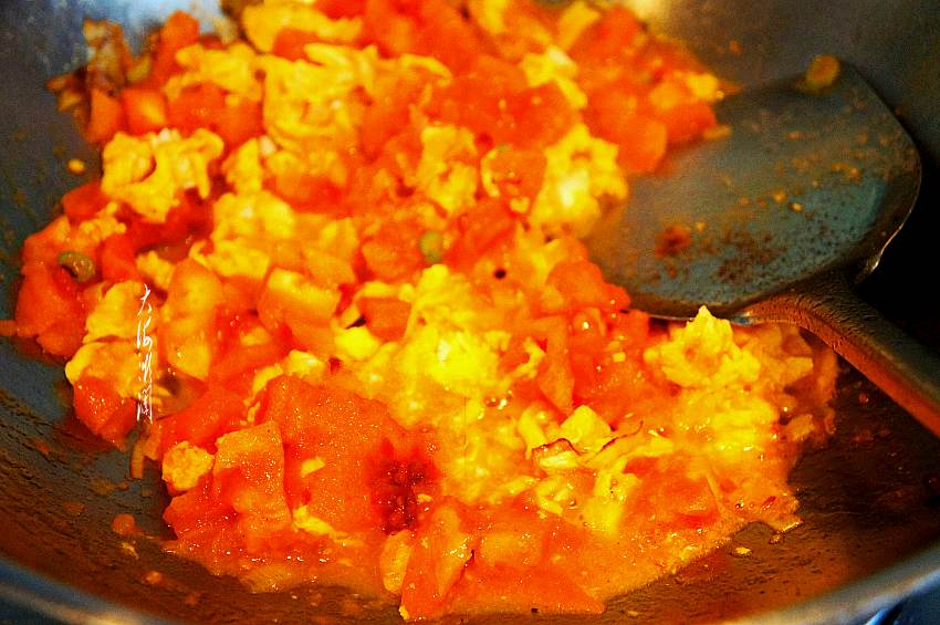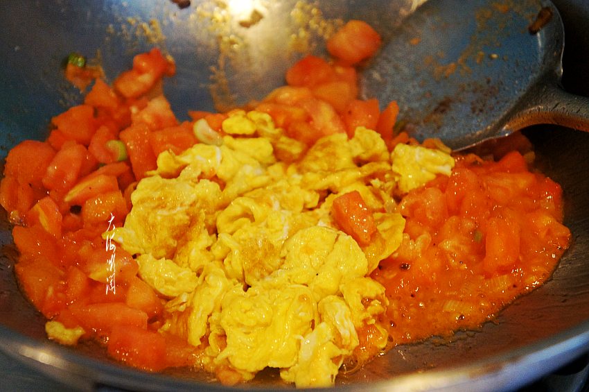 5、待番茄丁炒至出汤汁,加入煎好的鸡蛋翻炒均匀。
