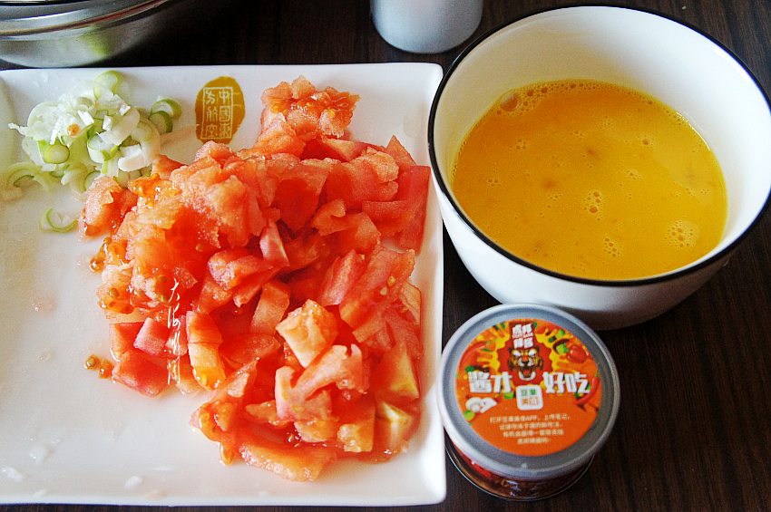 2、葱去皮洗净切碎,西红柿切丁,鸡蛋打散搅拌均匀,可以兑少许水,炒出来更滑嫩。辣椒酱我用的是虎牌辣椒酱,有点辣,可根据口感适量加减。
