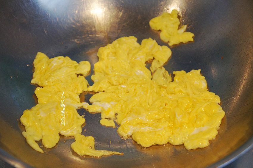 3、炒锅加入适量的油,倒入搅拌好的蛋液,迅速用筷子滑散煎熟,出锅备用。