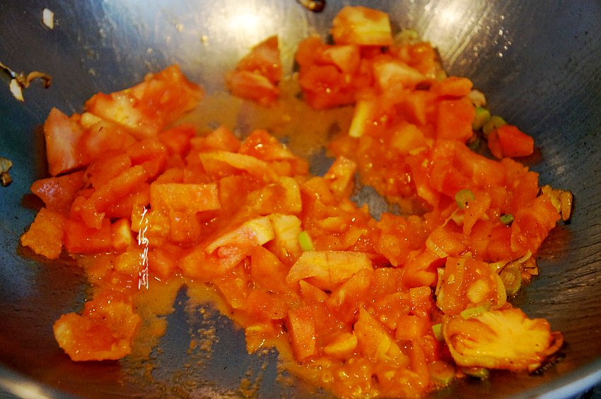 4、另起油锅,或者用煎蛋的余油爆香葱花、五香粉,加入番茄丁翻炒。