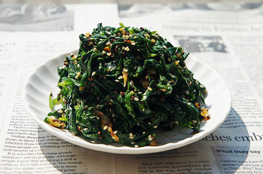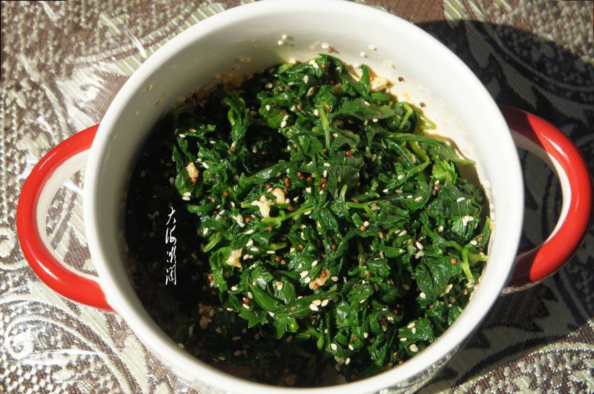 【凉拌芹菜叶】所需食材:芹菜叶适量;熟白芝麻适量;熟苏子适量;大蒜适量;辣椒油适量盐适量;白糖适量。
