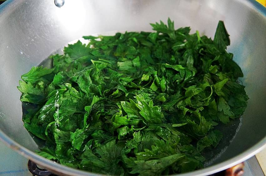 3、捞出来的芹菜叶迅速过冷水,然后攥掉水分备用。
