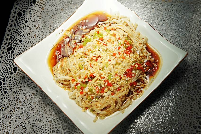 【白灼金针菇】金针菇焯水,不像平时的打水焯需要加水,直接倒入锅中4~5分钟OK了,撒上调味料,浇上蚝油和热油,上桌啦,就这么简单快捷。