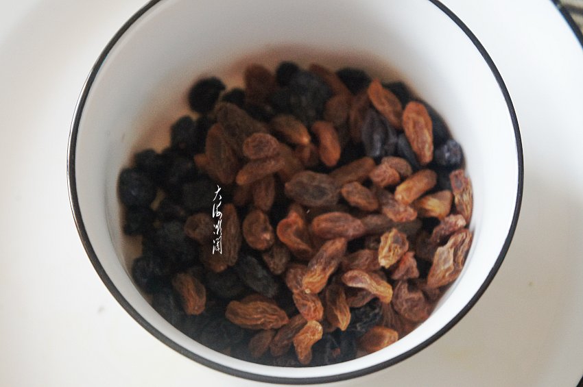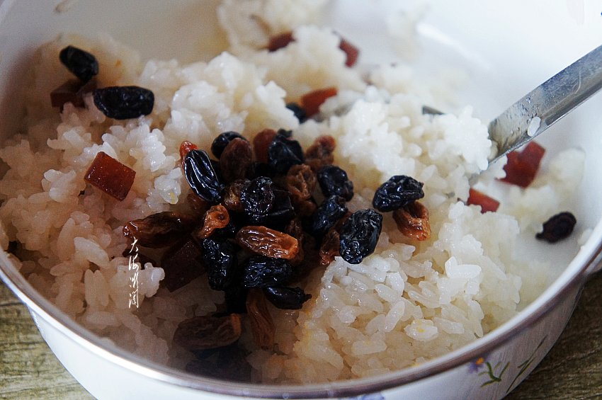 剩糯米饭装入耐高温容器,入微波炉转1分钟,各家的微波炉不同,请根据自己家的微波炉设置,取出稍凉,葡萄干、蓝莓干冷水浸泡2~3分钟,反复冲洗干净,山楂糕切丁。
