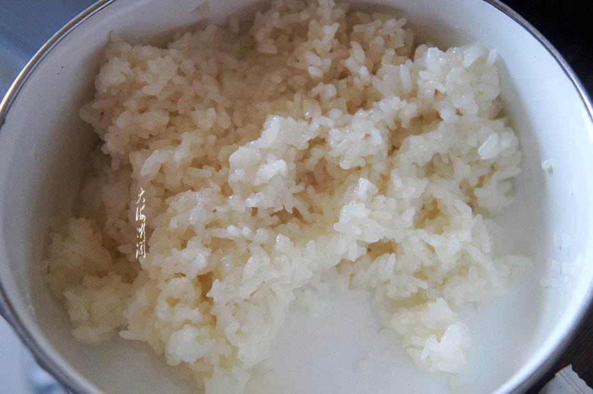 准备好糯米饭,这是做糯米糕剩下的糯米饭,小朋友要吃饭团子,糯米饭黏性大,适合做甜食,于是搭配一些果干,加少许白糖做成果味饭团子,孩子特别爱吃。