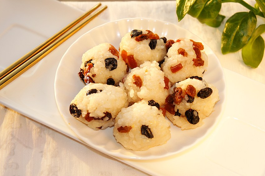 【果味饭团子】所需食材:糯米饭数量;蓝莓干适量;葡萄干适量;山楂糕数量;白糖少许。
