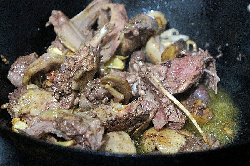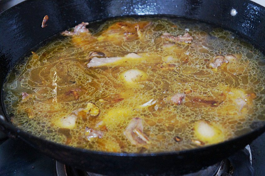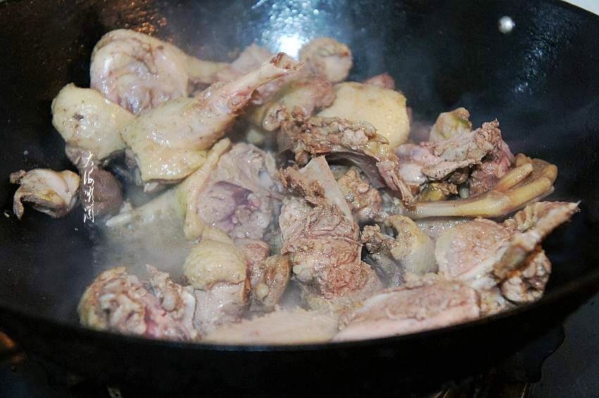 烹入料酒,再翻炒几下,加入适量的水,大火烧开,焖20分钟左右。