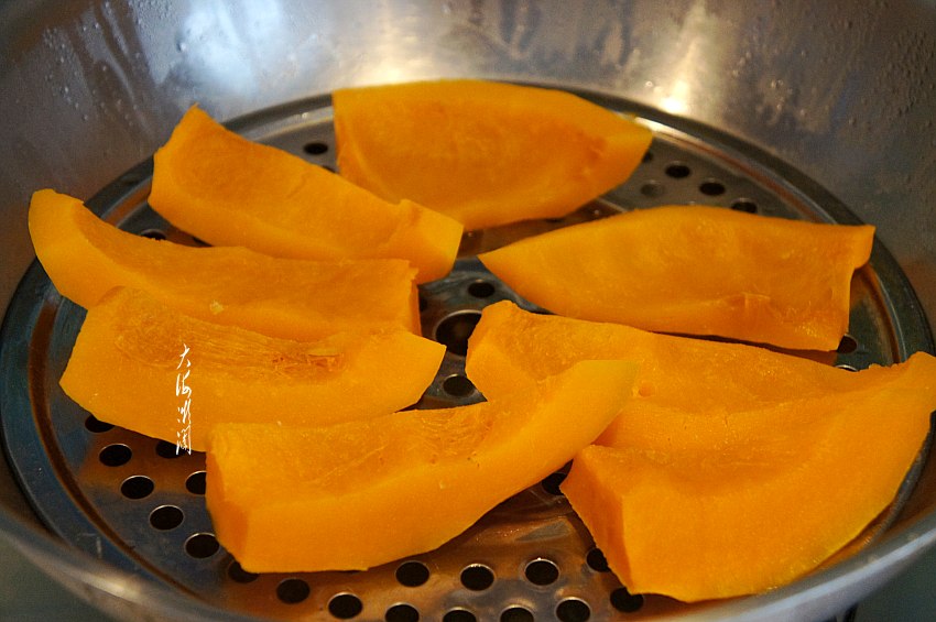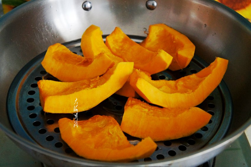 处理好的南瓜上屉大火烧开,蒸5~7分钟左右,蒸熟即可。