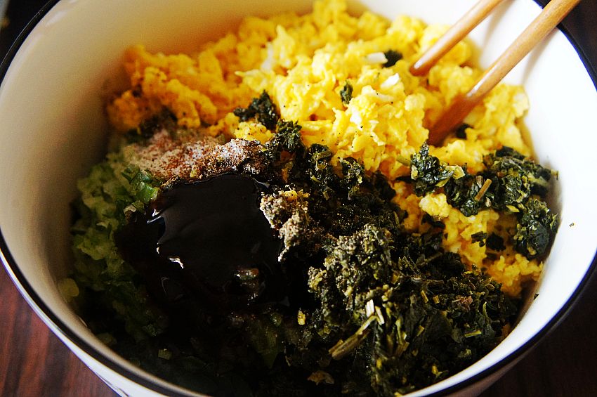 取大盆,加入刺五加叶、葱碎、鸡蛋碎,加入五香粉、胡椒粉、蘑菇粉、盐、蚝油搅拌均匀。