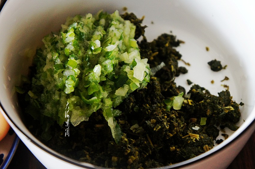 冰箱取出刺五加叶解冻,然后清洗干净,攥掉水分,切碎即可。大葱去皮洗净切碎,素馅饺子大葱可以多放点,提味还鲜亮。