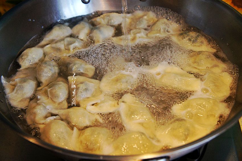 煮饺子:锅中加入适量的水,水开下入饺子,煮开浇点冷水,再煮开再次浇点冷水,第三次煮开关火,捞出,饺子煮的恰到好处。