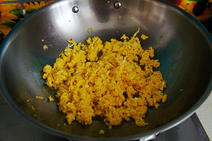 鸡蛋打散搅拌均匀,少许兑点水,让鸡蛋更嫩一些。炒锅加入适量的油,可以适量多加一些,拌馅时不另加油了,油开倒入蛋液,迅速用筷子搅拌,越碎越好,然后取出备用。