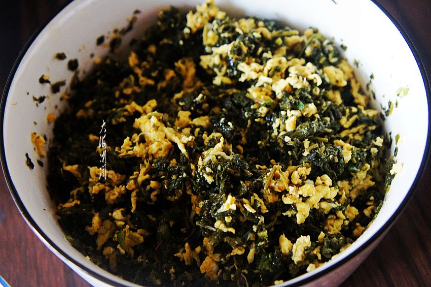【刺五加叶馅水饺】所需食材:面粉300g;鸡蛋5个;刺五加叶适量;油适量;盐适量;葱适量;五香粉适量;胡椒粉适量;蘑菇粉适量;蚝油适量。