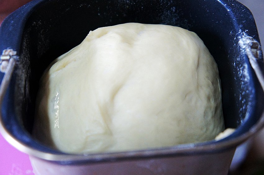 将牛奶、蛋液、油等液体依次加入面包桶,加入盐和白糖,筛入面包粉,加入酵母,启动两个和面程序,大约需要40分钟,然后启动发酵程序,时间是1小时30分钟。