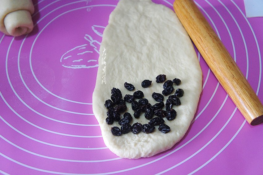 取一个面团从中间向两边擀成椭圆形,靠近自己的这一侧放上洗干净的葡萄干,并从这一侧卷起来,依此类推,完成4个面包的制作。