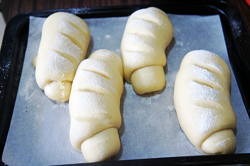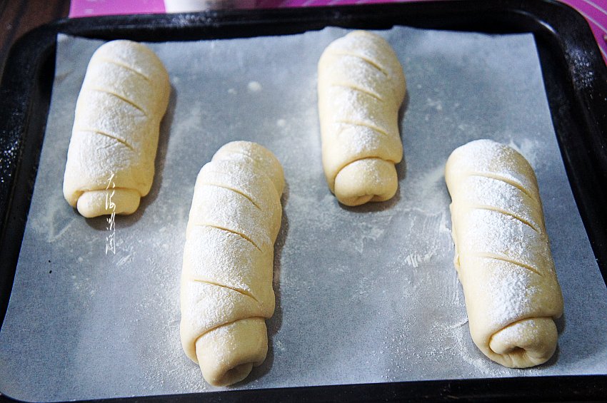 烤盘铺上油纸,做好的面包码入烤盘。用快刀在每个面包上斜切三道,至少切透一层,然后在面包的表面筛少许的面粉。不喜欢筛面粉,可以二次发酵后刷蛋液。