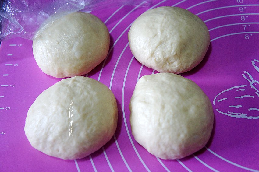 发酵好的面团从面包桶中取出,反复揉匀,排出气体,均匀的分成4个面剂子,盖上保鲜膜饧15分钟。