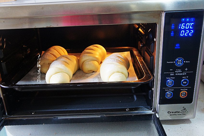二发结束,取出烤盘,烤箱设置160度预热5分钟,这期间如果需要刷蛋液的可以给面包刷上蛋液,我筛了面粉就不需要刷蛋液了。