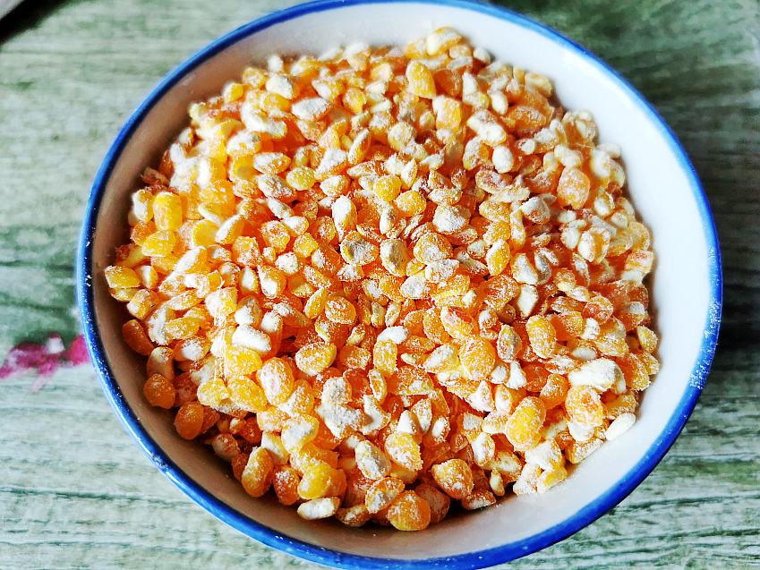 秋收的新玉米,被加工成大碴子,还带着加工后的玉米粉呢,大碴子淘洗干净备用。