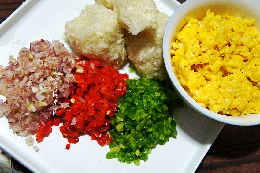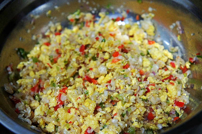 鸡蛋打散搅拌均匀,少许兑点水,让鸡蛋更嫩一些。炒锅加入适量的油,可以适量多加一些,拌馅时不另加油了,油开倒入蛋液,迅速用筷子搅拌,越碎越好,然后取出备用。清、红椒切碎,葱头去皮洗净切碎,葱头北方叫毛葱,包饺子特别提味,比大葱更鲜亮,如果没有毛葱,可换成大葱,多放一点味道更鲜美。腌制好的白菜攥掉水分。