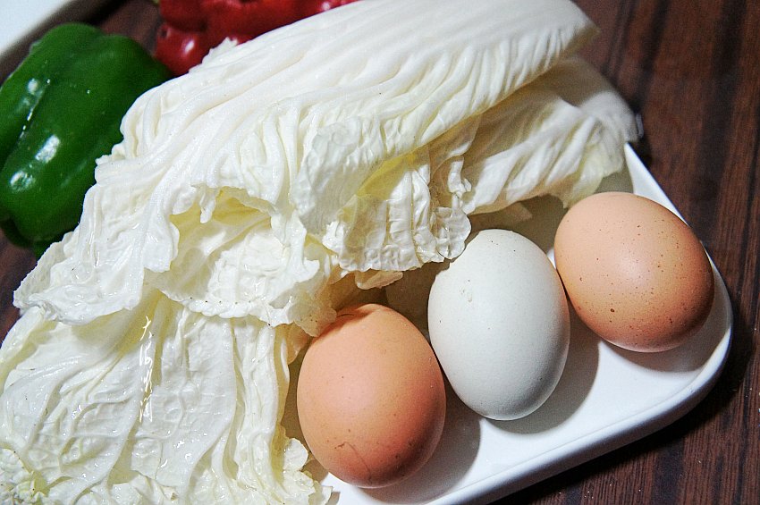【白菜馅水饺】所需食材:面粉300g;鸡蛋3个;白菜适量;青椒半个;红椒半个;油适量;盐适量;毛葱适量;五香粉适量;胡椒粉适量;蘑菇粉适量;蚝油适量。