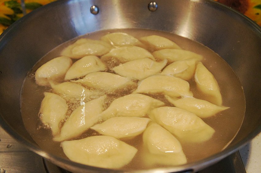 2、煮饺子:饺子入锅煮开浇冷水,第二次水开再浇冷水,第三次水开即可捞出,饺子煮的恰到好处。