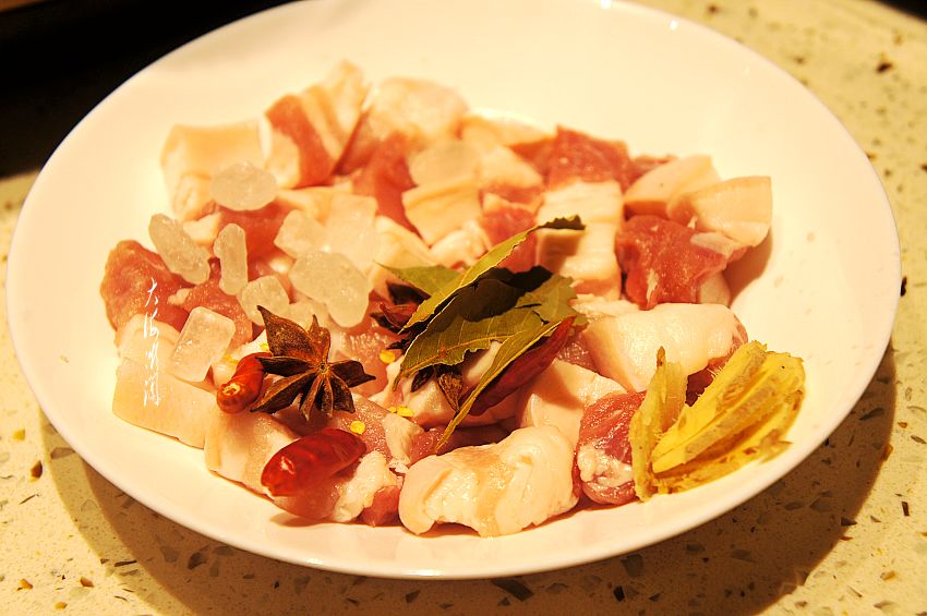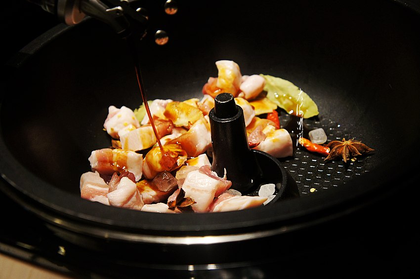 打开自动炒菜机,倒入五花肉和所有调味料。